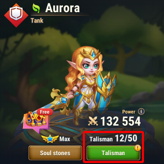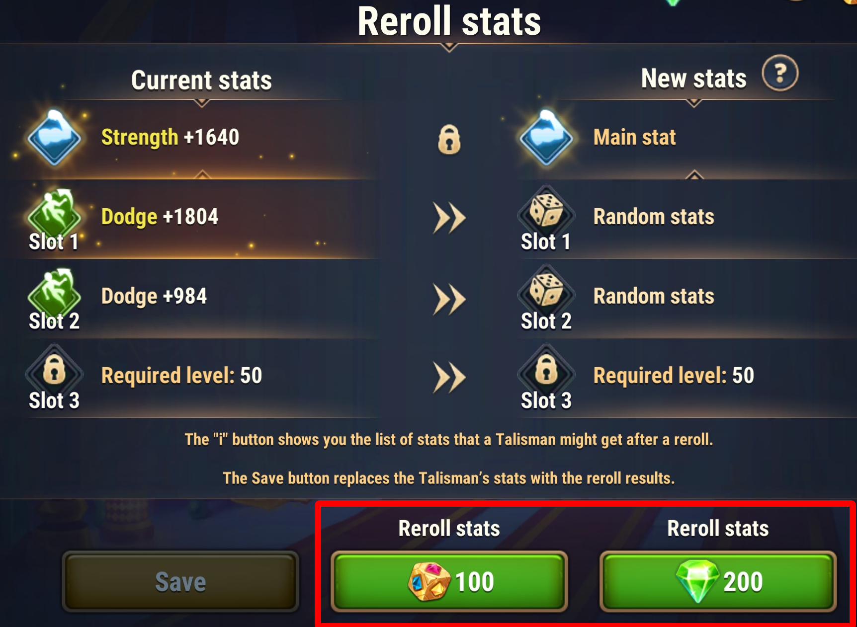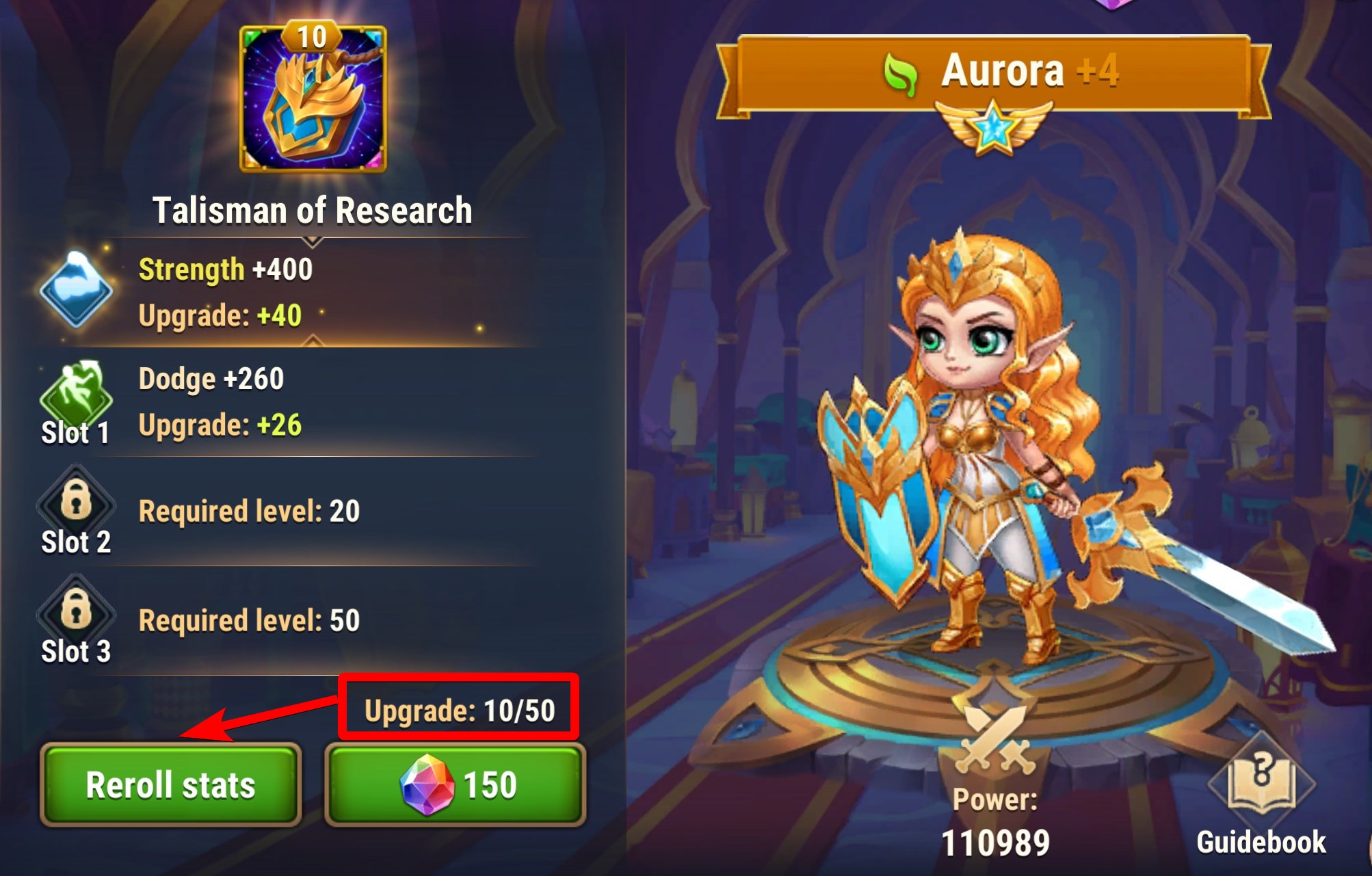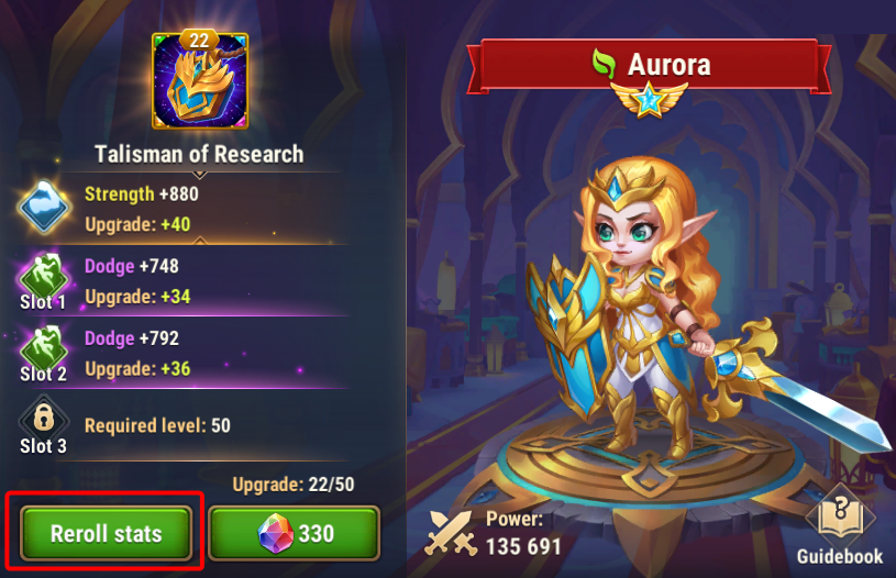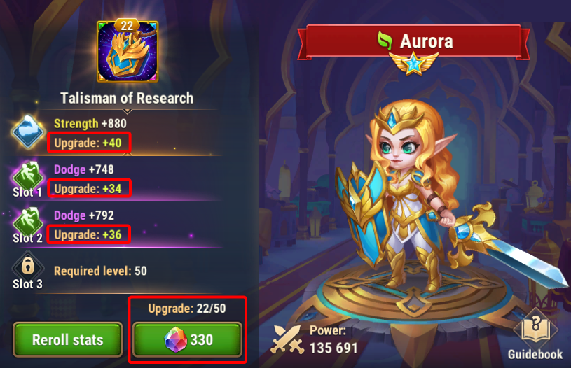 - The first slot always upgrades the main stat of a hero. For example, Aurora's main stat is strength, so her Talisman upgrades her strength stat. You cannot reroll the main stat. To upgrade it, you need to level up the Talisman in the Talisman menu.