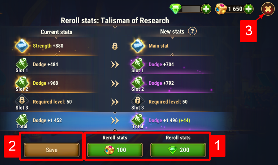After you have rerolled the stats, you will have three options: to reroll them once more using Meta Cubes or emeralds (1), save the reroll results (2), or leave without saving (3) if the results do not satisfy you. Meta Cubes or emeralds are spent in any case.