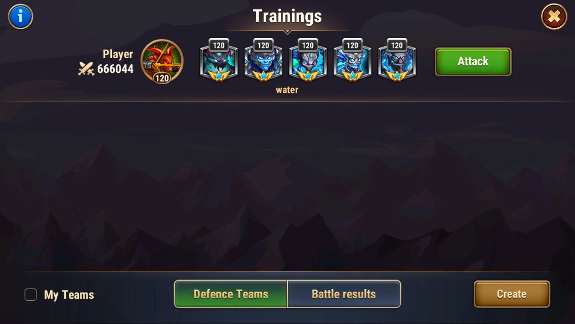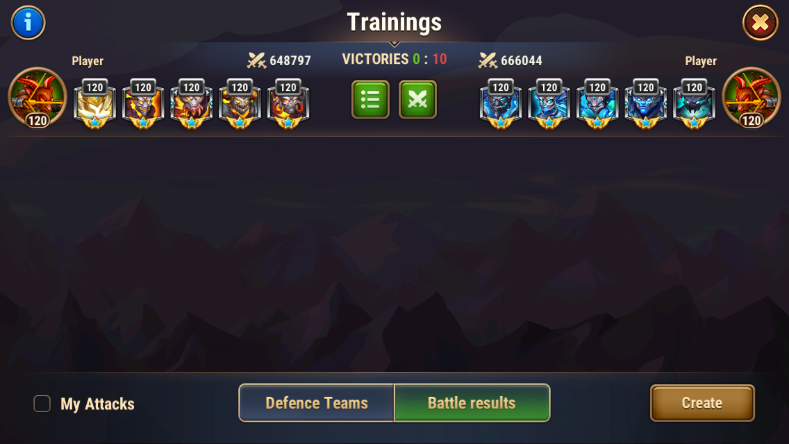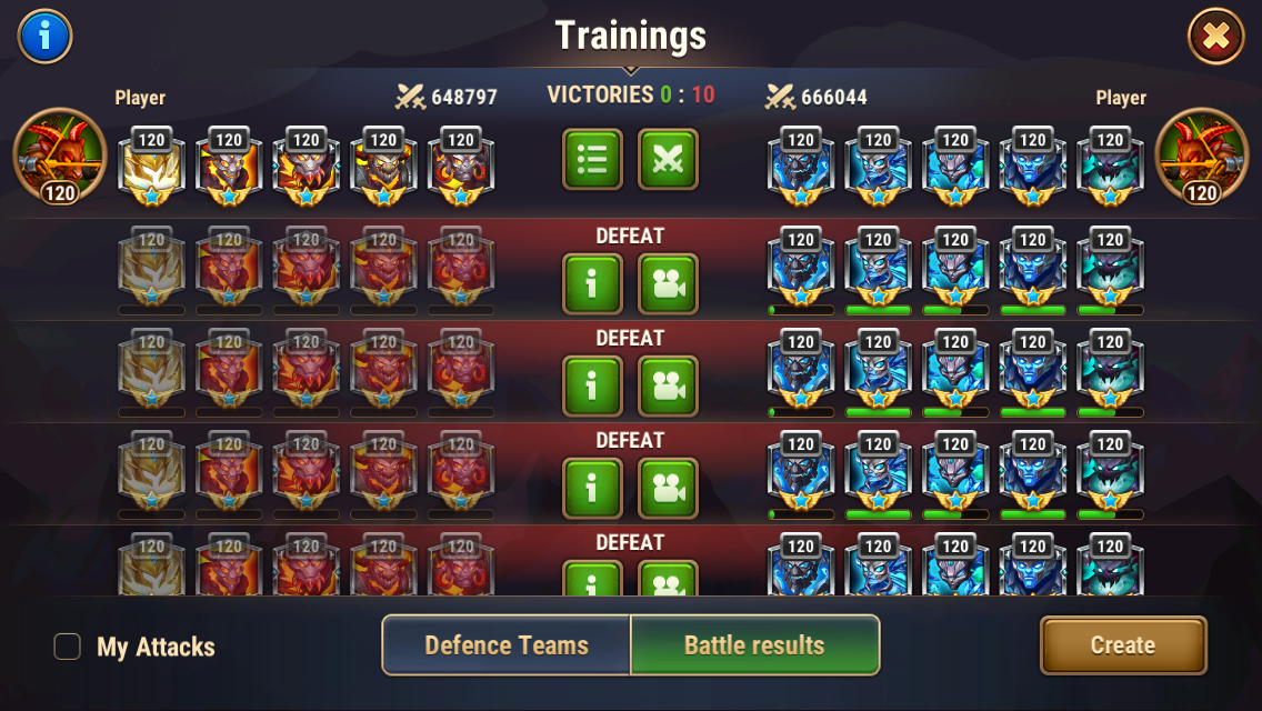 To gather your defense team, tap Create in the lower-right corner of the Trainings screen. After selecting the battle type and the team, you can assign a name to the training battle. You can launch one or ten battles at once.