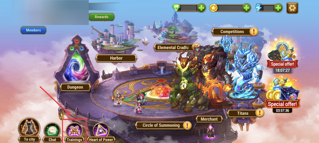 The Trainings mode unlocks at level 30 after joining the Guild. You can find it in the lower-left corner of the Guild screen.
