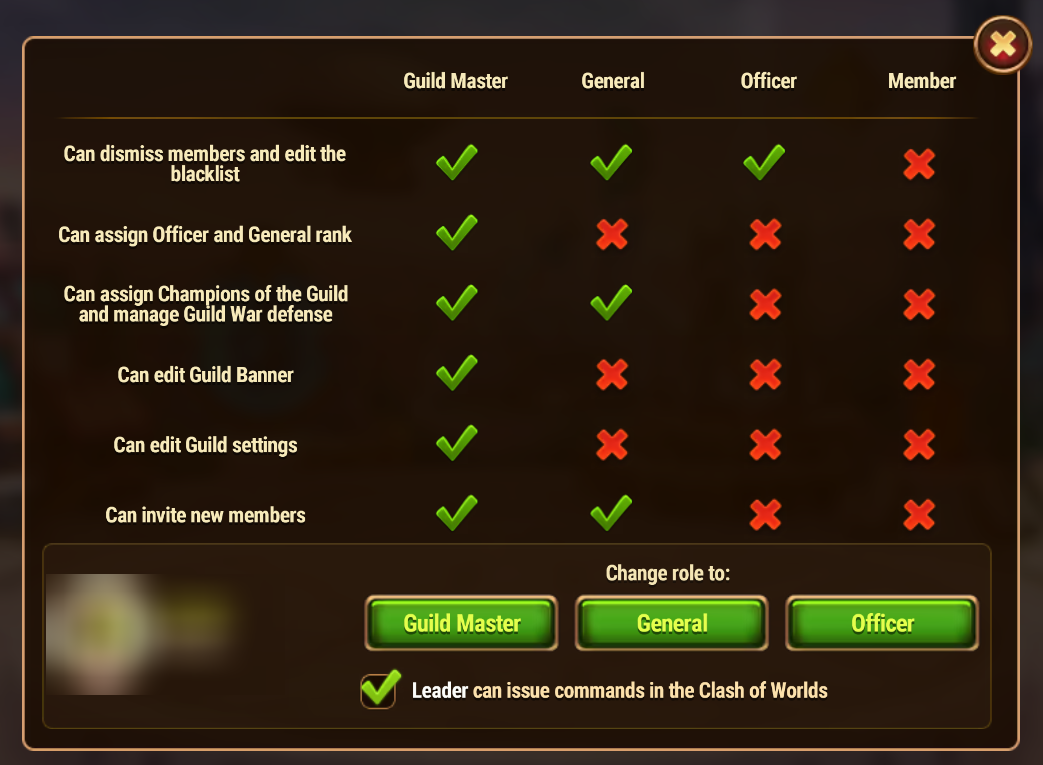 Different positions grant different access levels. For example, Guild Masters, Generals, and Officers can expel members and add them to the Guild's blacklist.