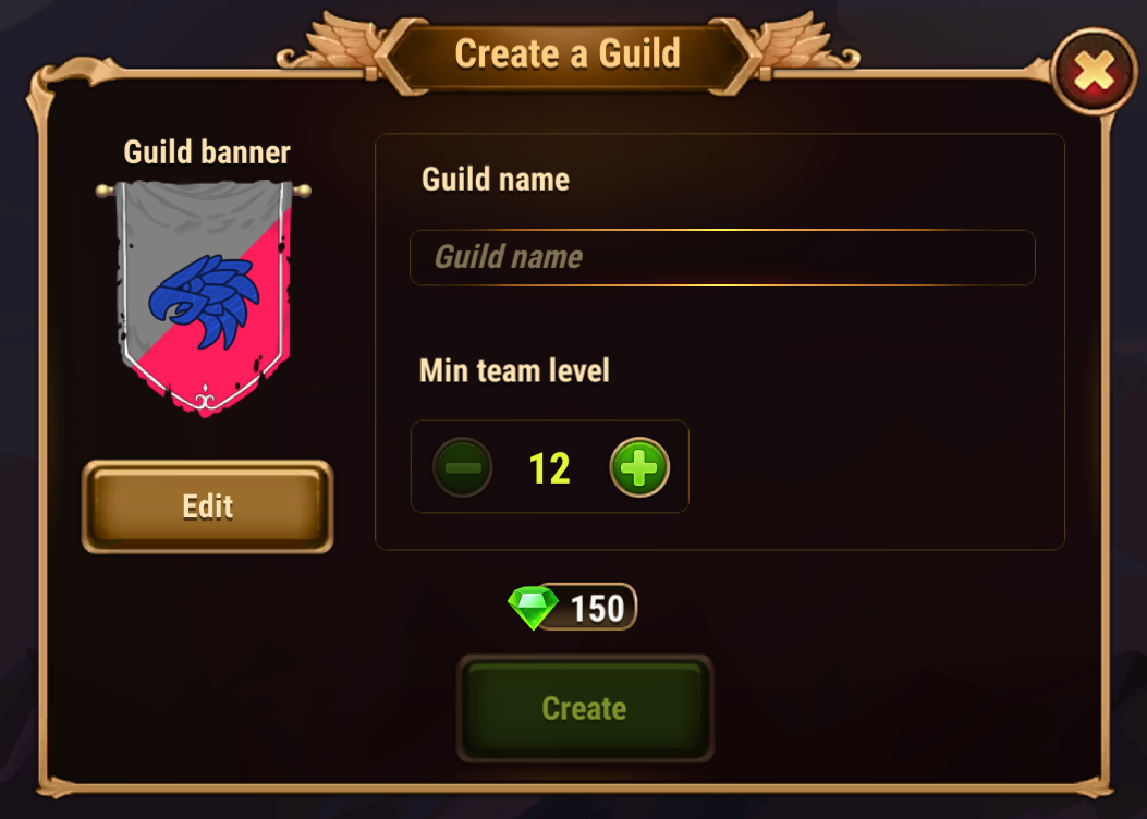 If you want to create your own Guild, press the Create guild button. You will have to choose your Guild name, minimum team level (from 30 to 120), and banner.