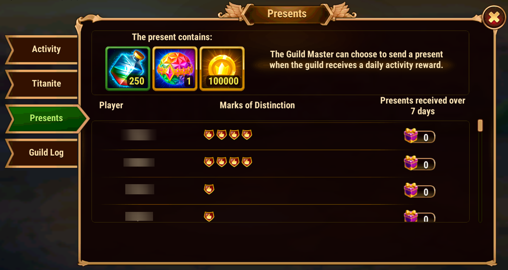 When a Guild gathers a certain amount of activity points, all members receive rewards — Enchantment Runes. In addition, the Guild gets the Guild Master's Presents. The Guild Master can distribute them.