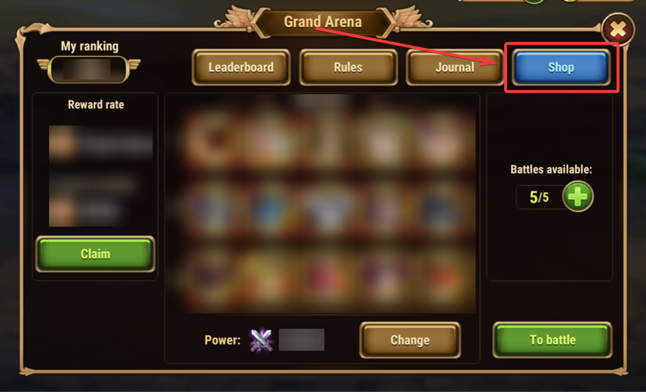 Grand Arena Shop becomes available at team level 50. You can access it by tapping Shop in the Grand Arena menu: