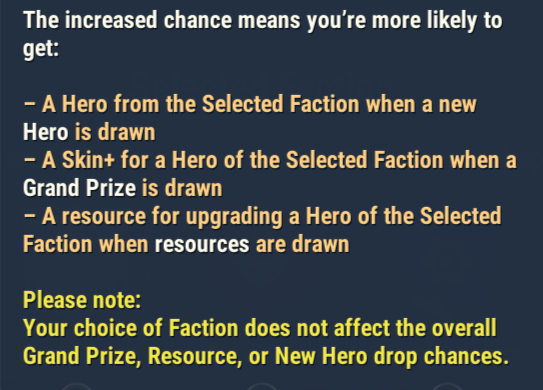 Selecting a Faction increases the chance of getting a hero from the selected Faction, resources for their upgrade, or a Skin+ for a hero of the Faction. However, you can still receive rewards and heroes belonging to other Factions.