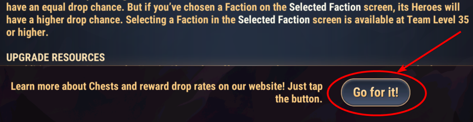 If you want to focus on upgrading certain heroes, select a Faction in Heroic Chest. The chance to get the heroes from that Faction will increase. This feature becomes available at team level 35.