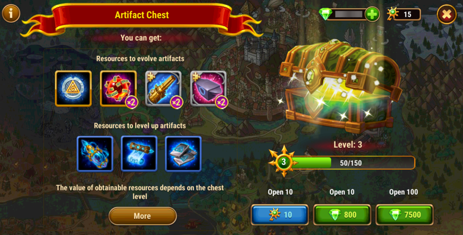 Artifact Chest contains hero artifacts fragments and resources, Chaos Cores, and Artifact Coins. Chaos Cores are required to increase artifact star level.