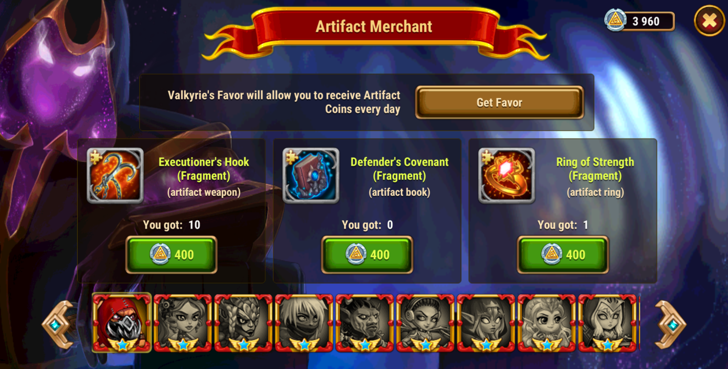 At the bottom of the screen is a list of available heroes. Tap the hero's portrait to open the list of artifact fragments you can purchase for them.