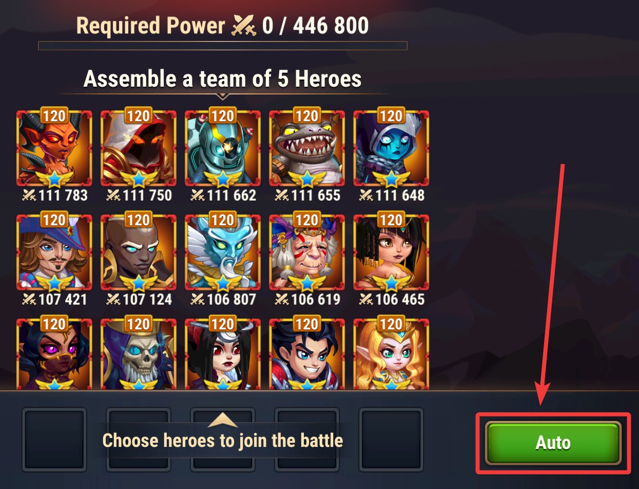 To go on an expedition, you need to gather a team of five heroes. Their total power must exceed the power indicated above the chosen expedition.