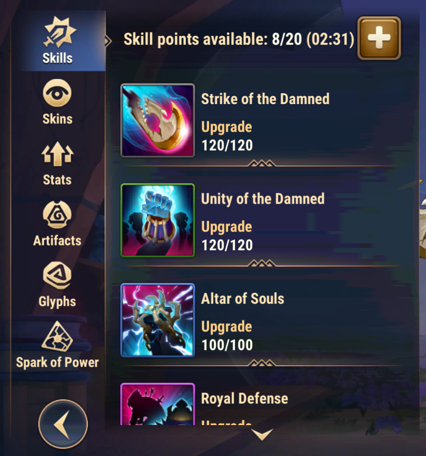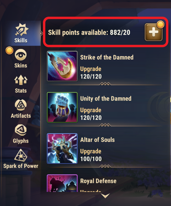 You need Skill Points to level up hero skills. After you use Points, it takes time for them to restore: you get one Point every five minutes. You can get a maximum of 20 Skill Points this way.