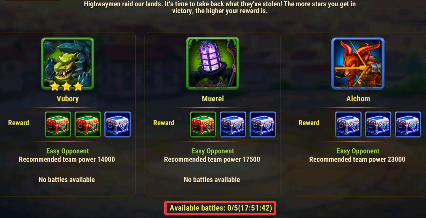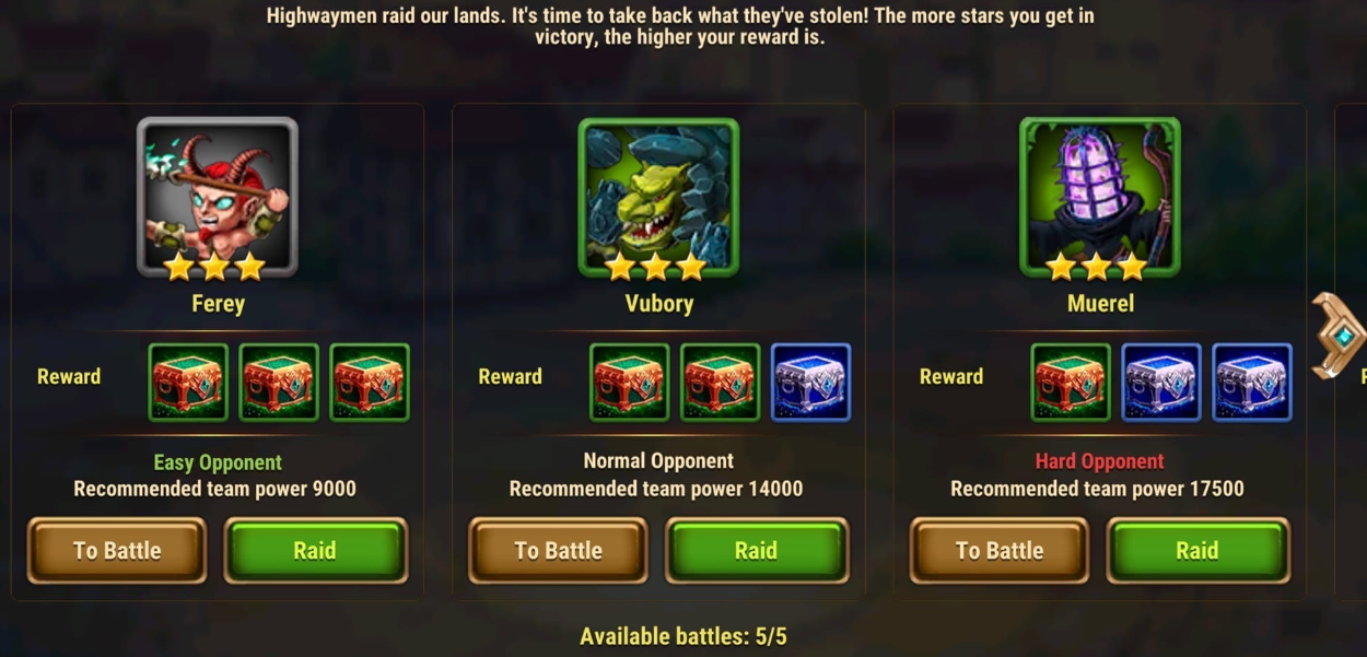 Each battle grants up to three Сhests (added to your Inventory), depending on the number of earned stars. Raids guarantee three Chests. Chest rarity depends on the difficulty of the opponent: