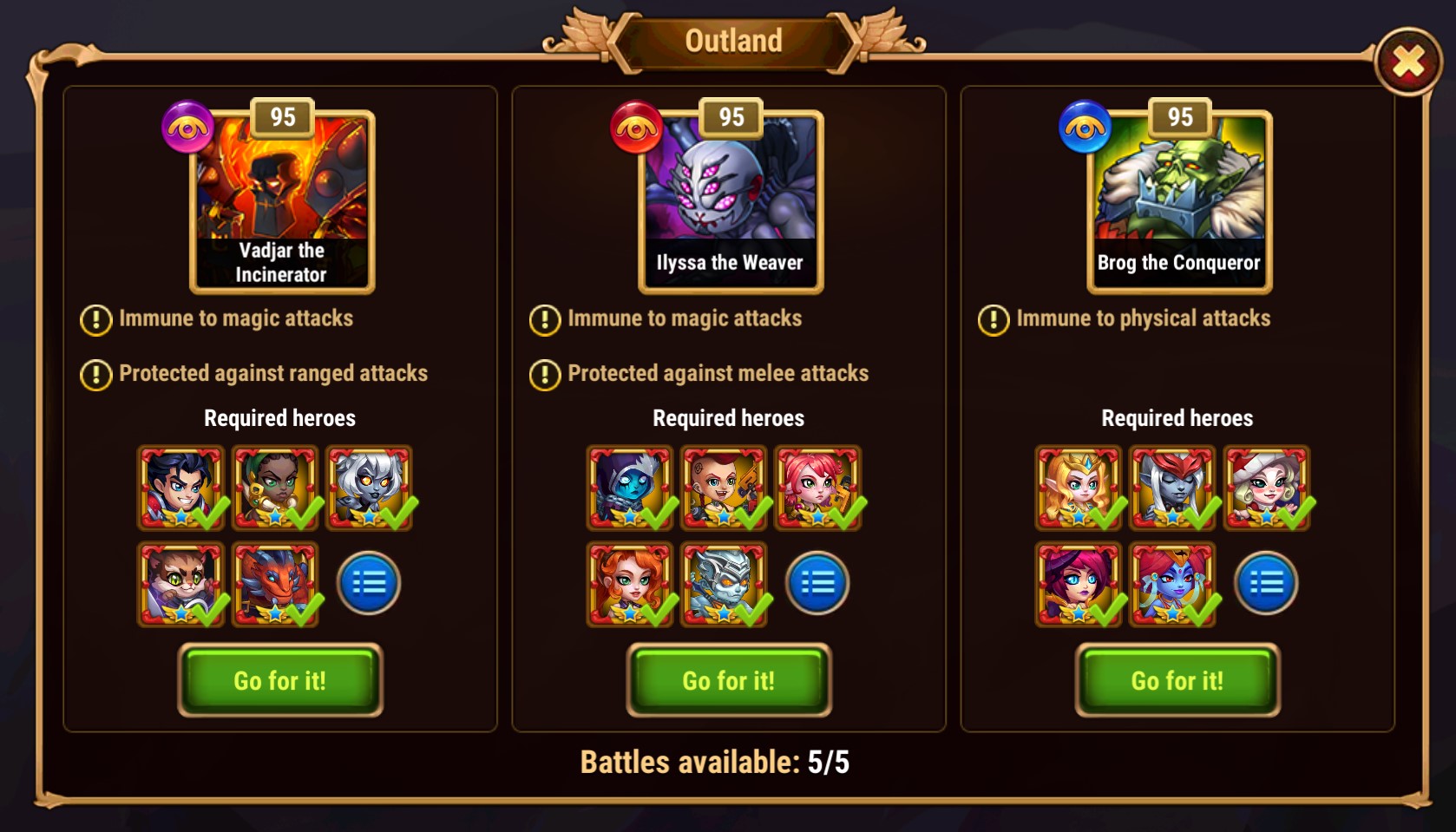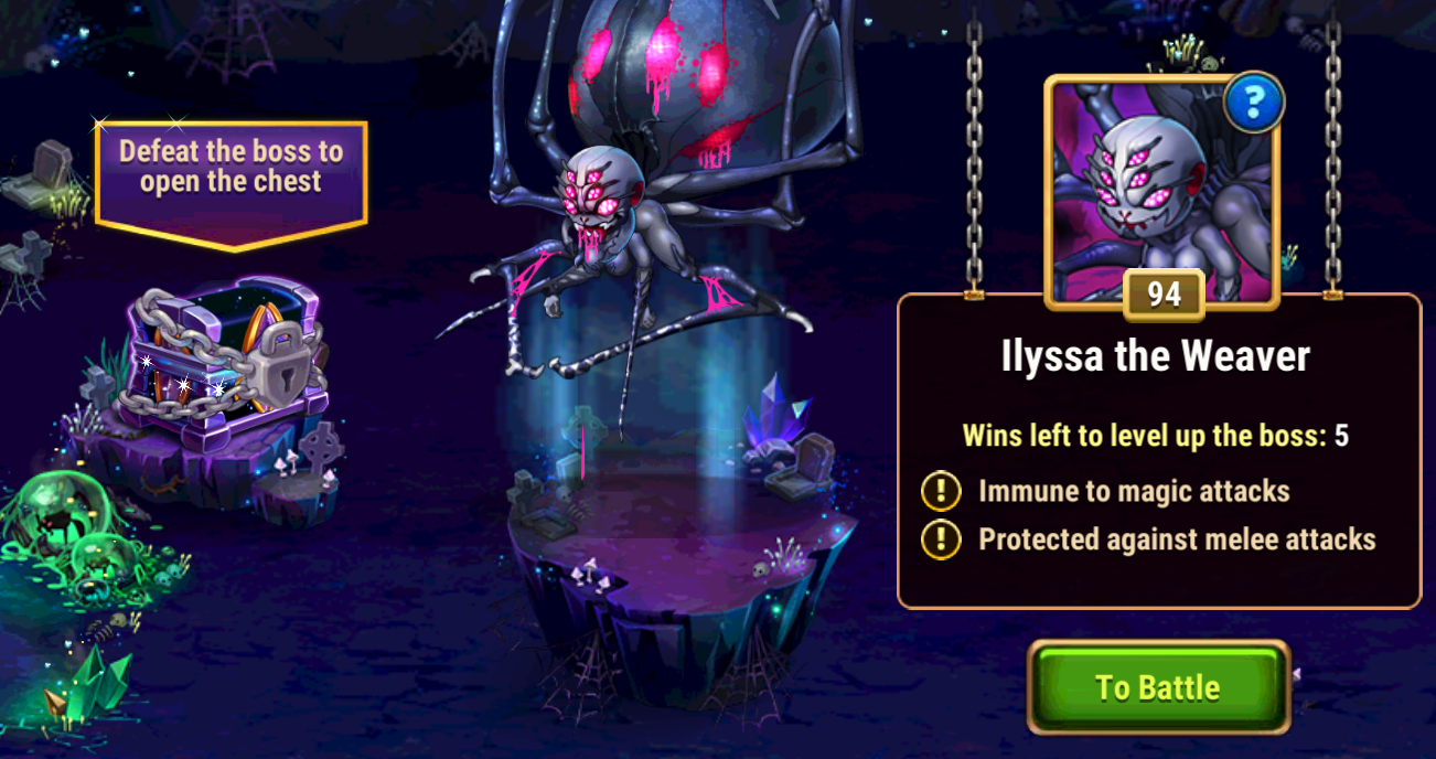 There are three bosses, each with unique features: Vadjar, Ilyssa, and Brog. Every day you get five attempts to defeat them. Also, you can spend emeralds to purchase additional attempts.