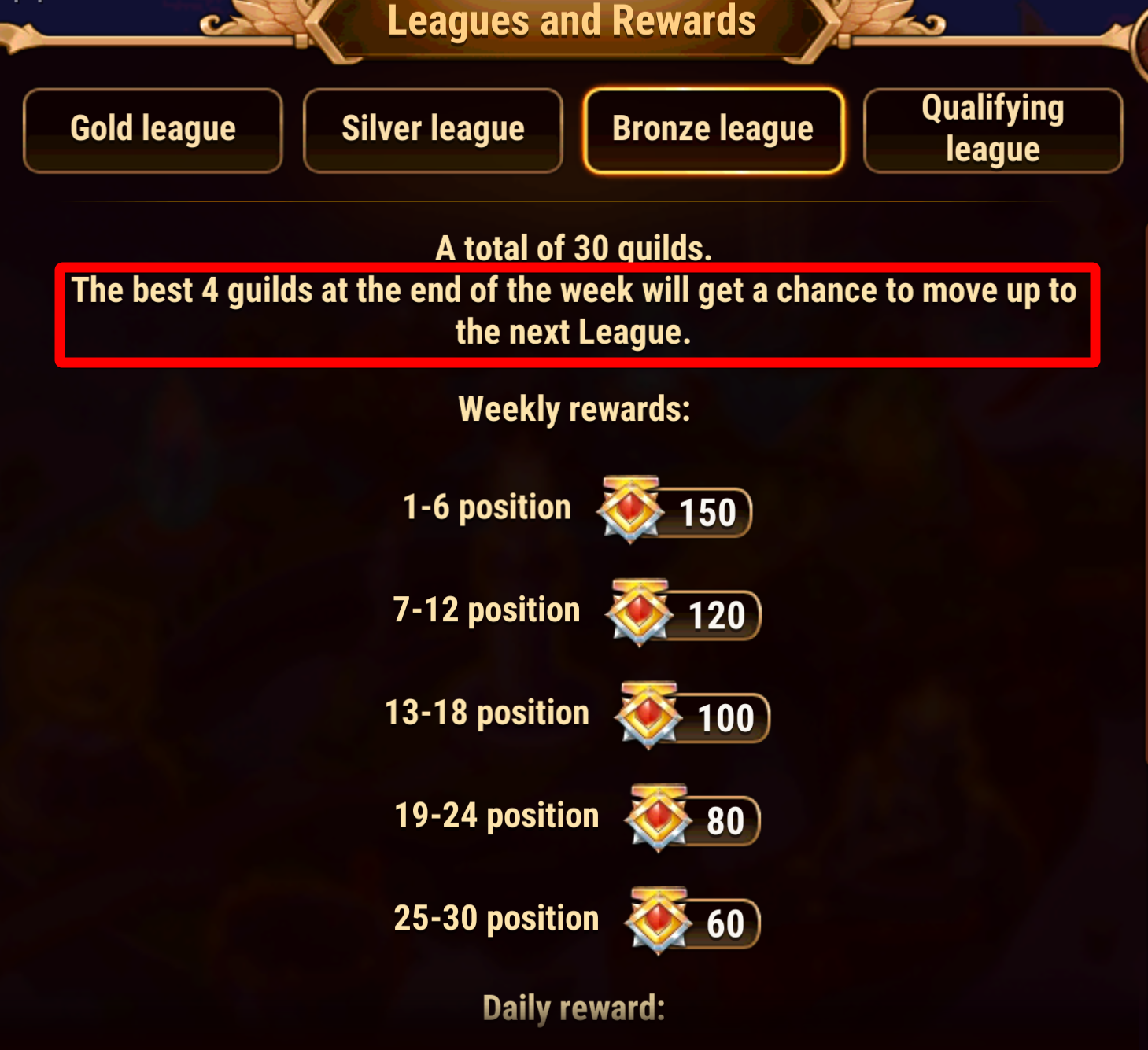 - The top four Guilds from the Bronze league fight against the bottom four Guilds from the Silver league.