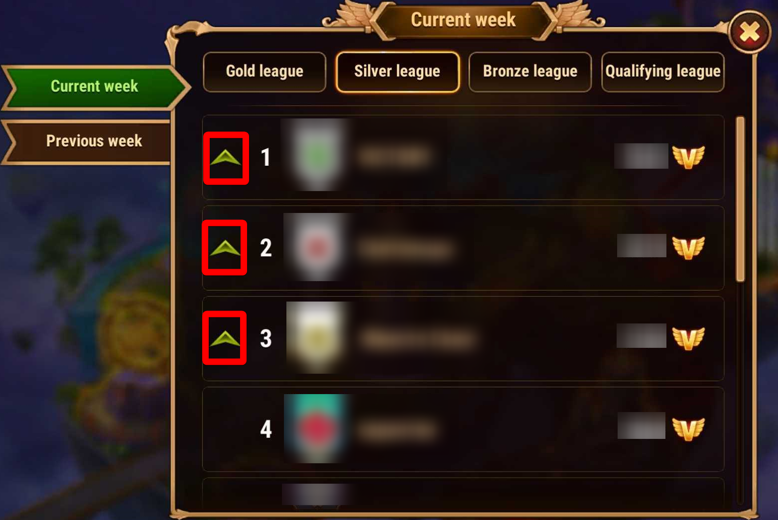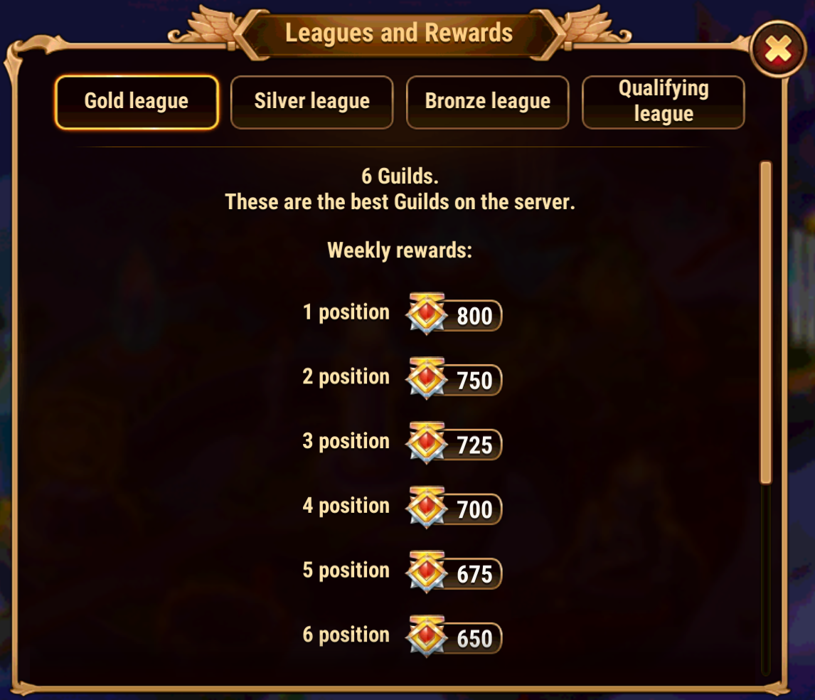 For example, if a Guild took first place the previous week, in the case of a draw, it'd be the first the current week as well. The same rule works when a Guild moves to a new league: if this Guild took first place the previous week and then moved to another league, in the case of a draw, it'd also be one of the first in the new league the current week.