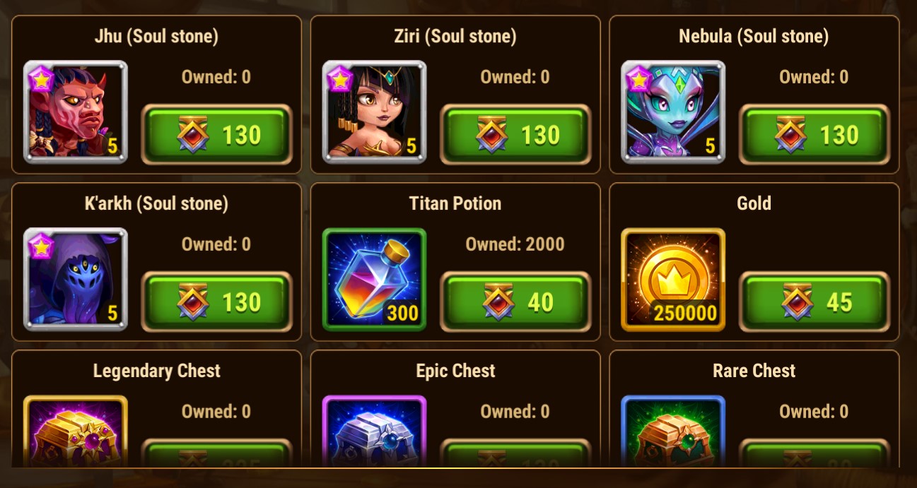 Here, you can spend Guild War Trophies to purchase unique Champion's skins, Titan Potions, Chests of different rarity, gold, and Soul Stones of Jhu, Ziri, Nebula, and K'arkh.
