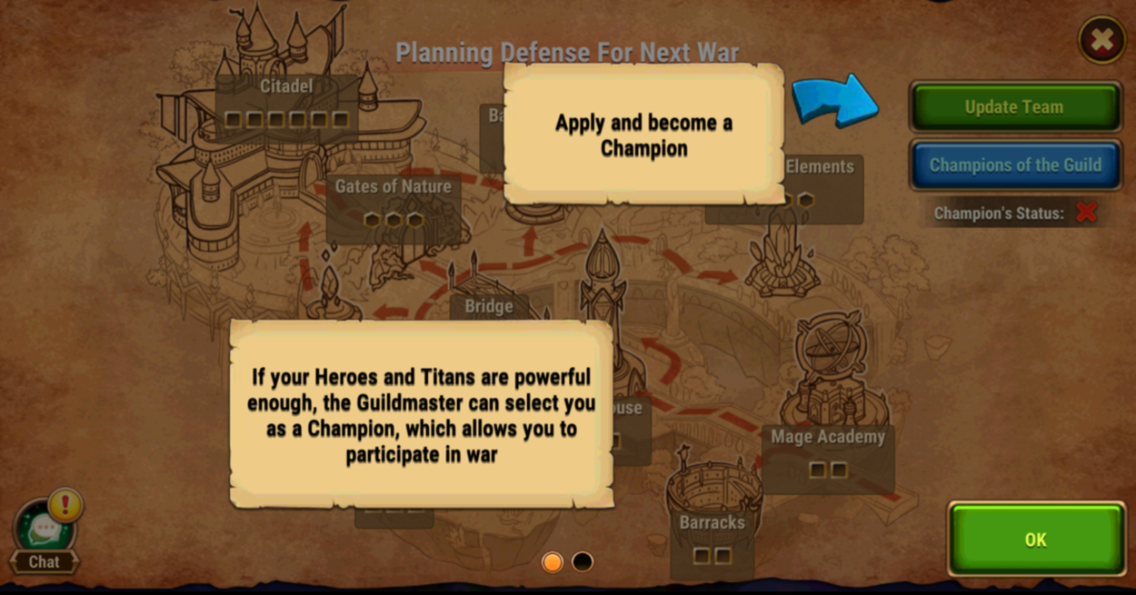 A Guild can participate in the Guild War only if there are at least five Champions. Champions are Guild members who can participate in Guild War. Guild Master and Generals select them.