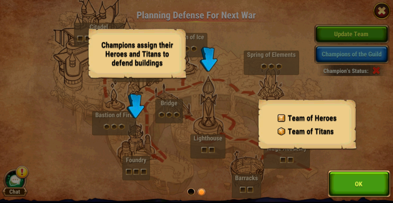 To change your current teams of heroes and titans, tap the Update Team button. The changes will be applied on the next day when the Guild War starts.