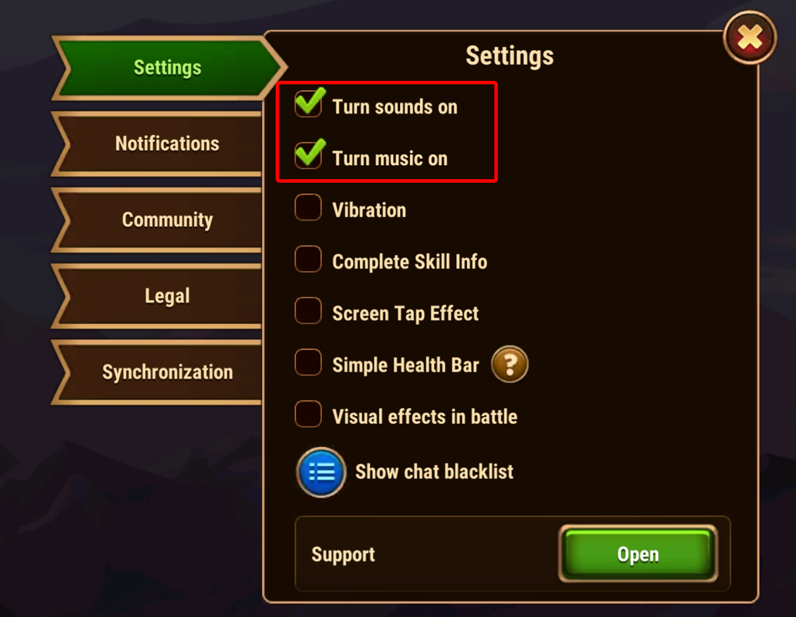 To access sound settings, select the gear button in the upper right corner of the game screen.