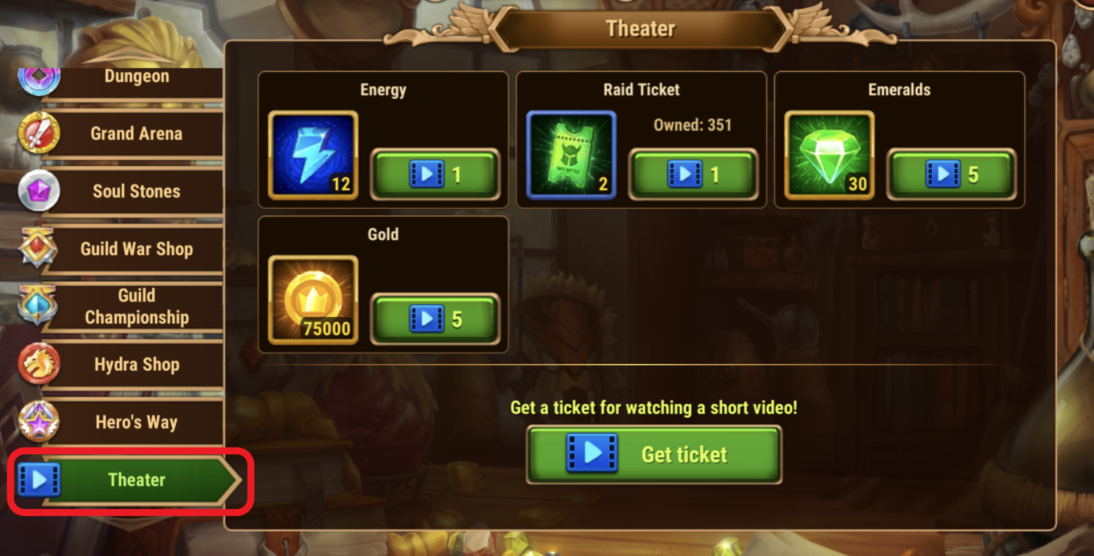 There you can watch short promotional videos to get Tickets. You can spend Tickets to buy energy, Raid Tickets, emeralds and gold. Every day you can earn up to eight Tickets.