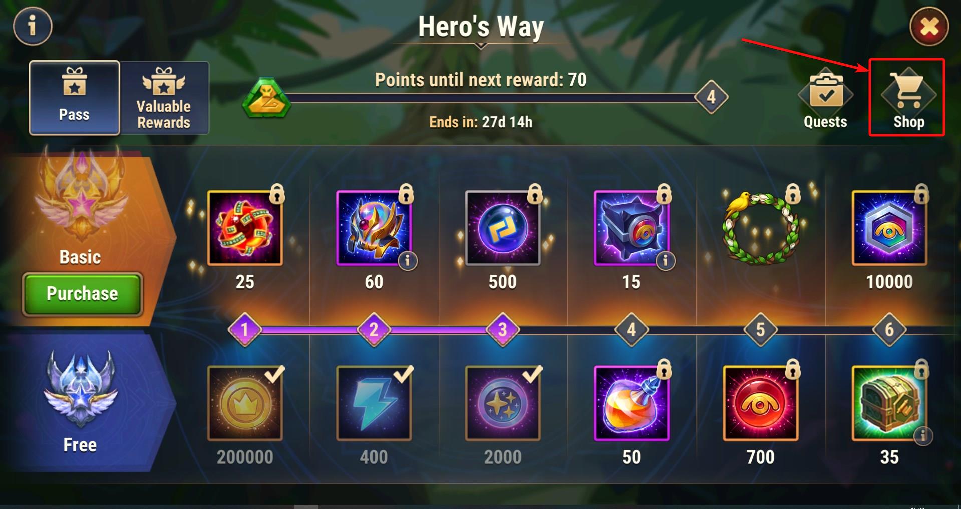 Hero's Way Shop becomes available once you complete the tutorial. You can access it by tapping the Shop tab in the upper right corner of the Hero's Way screen:
